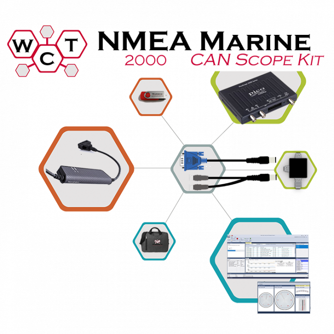 Marine NMEA2000 CAN Scope Kit – This kit is the same as the CAN Scope Kit, but with hardware (connectors) for the marine market. This kit allows the analysis of a CAN bus on the 3 main Layers of the CAN model – Physical Layer, Data Link Layer and the Application Layer (CANopen, J1939, NMEA2000 and Proprietary). It has all the features of the Commercial Vehicle Kit with the inclusion of PicoScope for Physical Layer analysis. This Kit consists of: